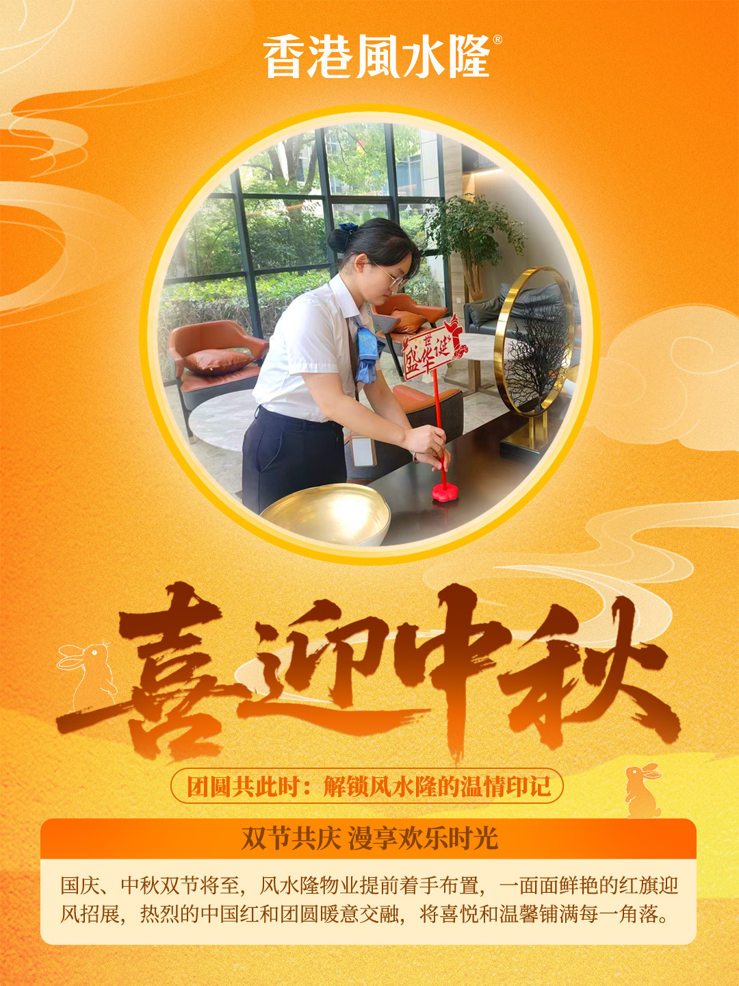 双节共庆 漫享欢乐时光:国庆、中秋双节将至,风水隆物业提前着手布置,一面面鲜艳的红旗迎风招展,热烈的中国红和团圆暖意交融,将喜悦和温馨铺满每一角落。